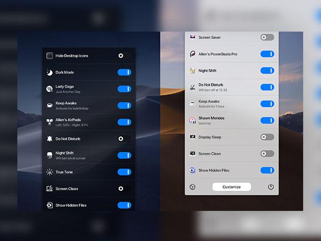 One Switch for Mac helps you regain those lost minutes. The app lives in your menu bar, providing easy access to key settings. When you click the icon, you get a simple drop-down menu of switches and options.
